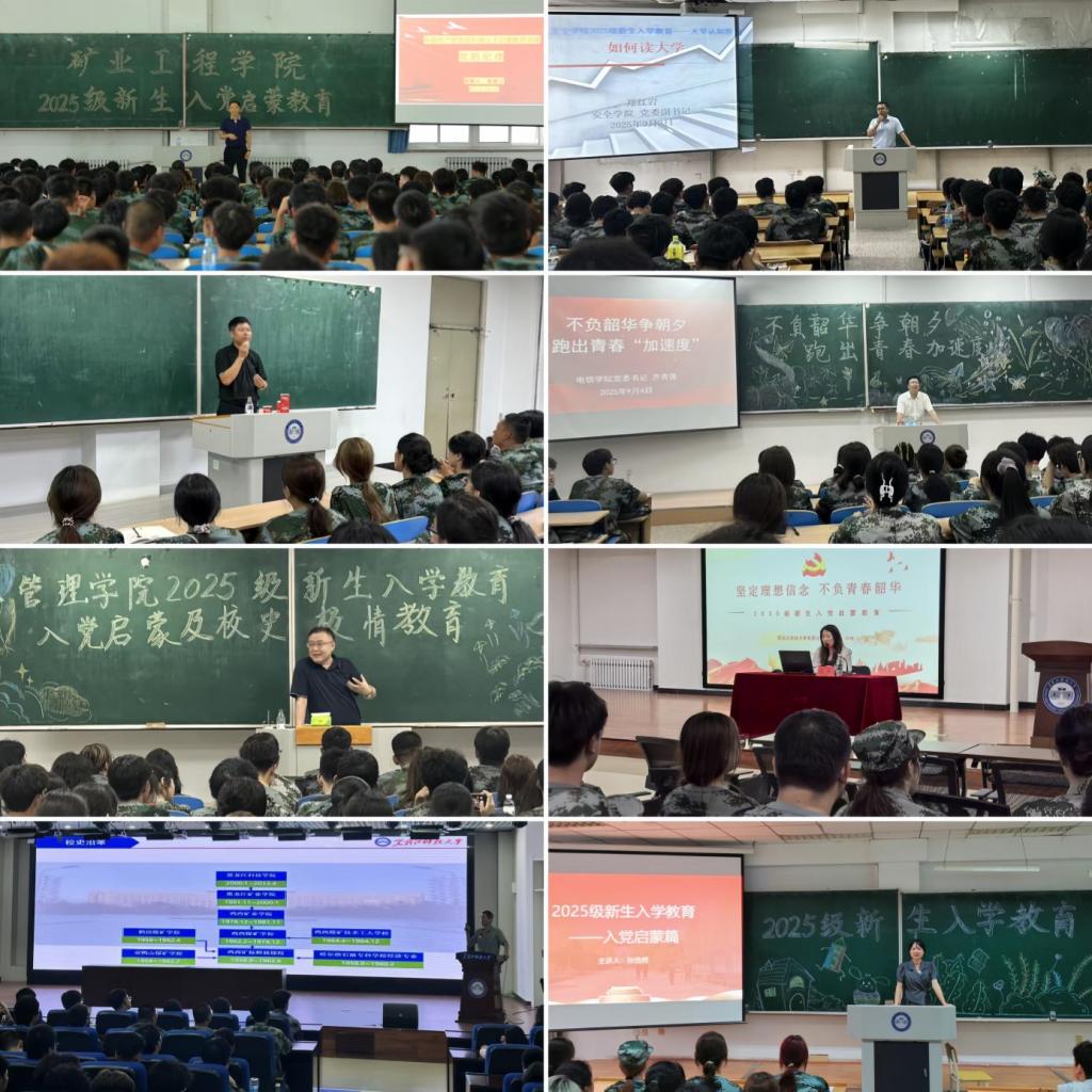 学工部(处)依托“易班”平台发布15门专题微课,涵盖思想教育、法治教育、学风建设、生活教育、就业教育、安全教育共6部分教育内容,精心打造“科大云课堂”,为新生筑牢线上学习阵地。各学院通过深化社会主义核心价值观教育,铸牢中华民族共同体意识,扎实推进德育实践,深入开展校史校情教育,引导树立正确的世界观人生观价值观、增强民族认同、锤炼品德修为、传承校训精神,着力培养担当民族复兴大任的时代新人。矿业学院、安全学院、电气学院、电信学院、经济学院强化部门联动,携手党委组织部联合开展新生入党启蒙教育,夯实新生思想根基;环化学院创新思政教育形式,将思政课融入国歌传唱、校歌学唱环节,以激昂旋律凝聚情感共鸣,在歌声中激发爱党爱国、爱校荣校情感。