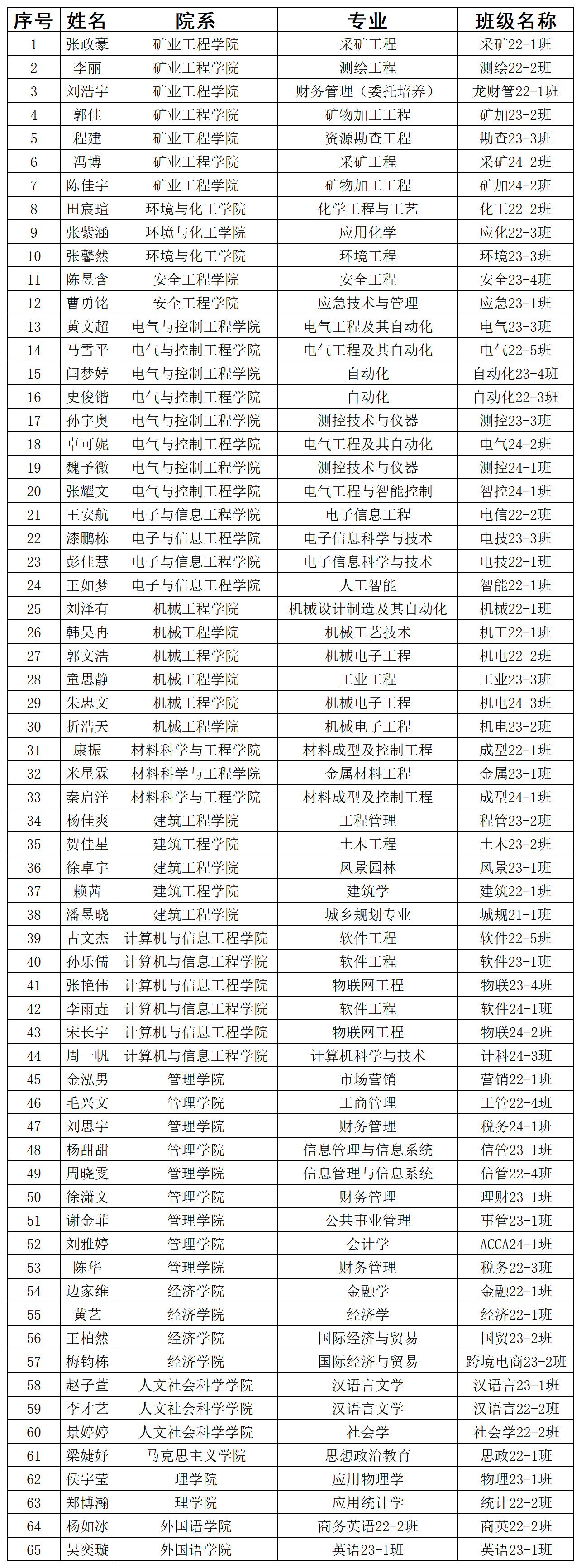 根据省教育厅《关于做好2025年普通高校本专科生国家奖学金工作的通知》要求,结合《黑龙江科技大学本科生奖助学金评审管理办法》,经过学生申请、班级推荐、学院评选、学校本科生资助工作办公室审核、学校本科生资助工作领导小组审议等程序,拟确定采矿22-1班张政豪等65名同学为2024-2025学年本科生国家奖学金获得者推荐人选,现予以公示。